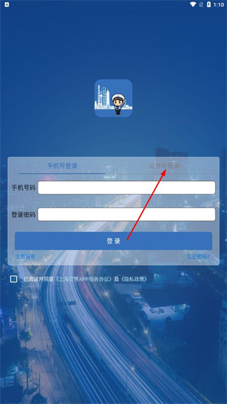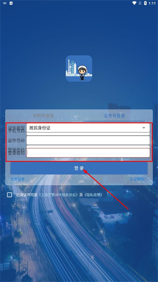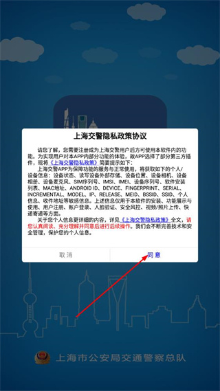1、在上海交警隱私政策協(xié)議彈窗中,點擊同意,進(jìn)入登錄頁面。