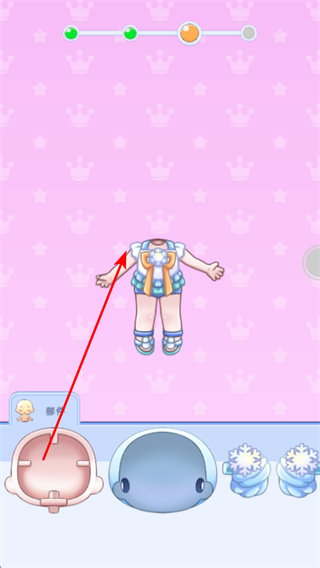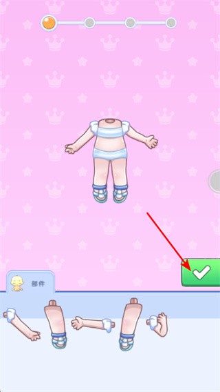 1、游戲中點擊綠色對勾按鈕,確認(rèn)角色部件搭配,這是推進(jìn)角色組裝的關(guān)鍵操作,點擊將完成當(dāng)前部件裝配。