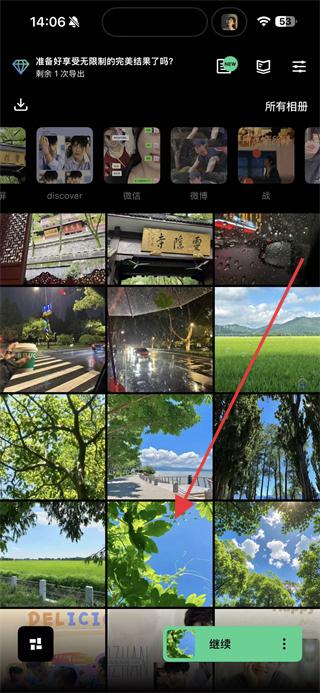 1、打開(kāi)TouchRetouch應(yīng)用,在相冊(cè)中選擇需要編輯的圖片,點(diǎn)擊繼續(xù)進(jìn)入編輯頁(yè)面。