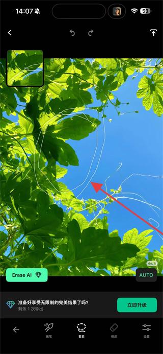 3、在物體去除界面,用標(biāo)記工具涂抹需要去除的物體區(qū)域,然后點(diǎn)擊Erase AI按鈕,應(yīng)用AI技術(shù)自動(dòng)去除標(biāo)記的物體。