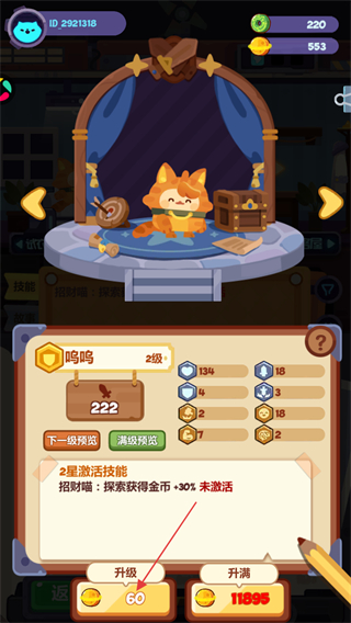4、雙擊角色打開(kāi)角色信息界面,點(diǎn)擊升級(jí)按鈕花費(fèi)金幣進(jìn)行升級(jí)完成任務(wù)。