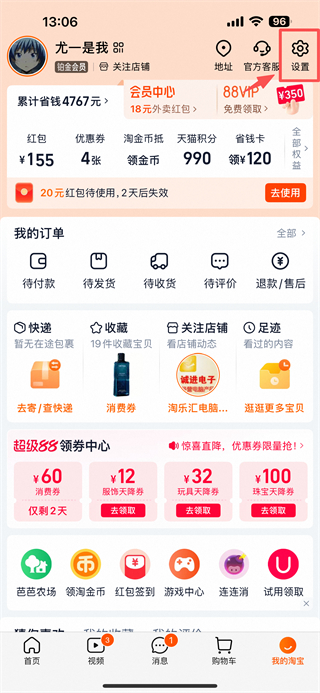 1、打開(kāi)淘寶APP,點(diǎn)擊底部我的淘寶選項(xiàng),進(jìn)入個(gè)人中心頁(yè)面。