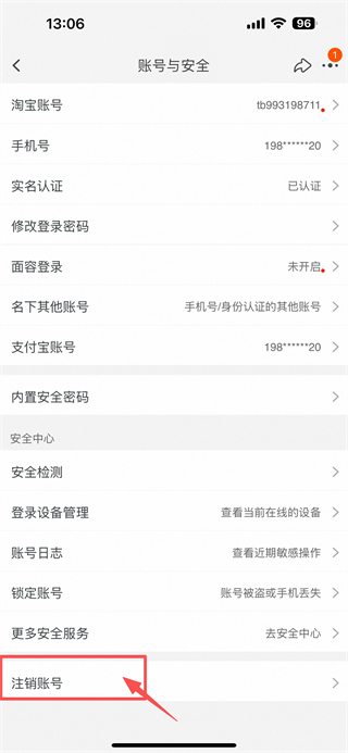 4、在賬號(hào)與安全頁(yè)面,點(diǎn)擊注銷賬號(hào)選項(xiàng),進(jìn)行淘寶賬號(hào)的注銷操作。