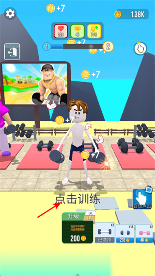 4、點擊點擊訓(xùn)練按鈕,可提升角色健身屬性,這是增強戰(zhàn)力的關(guān)鍵步驟,點擊時需及時進行訓(xùn)練以提升等級。