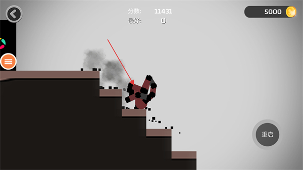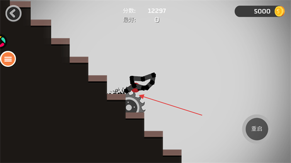 4、利用樓梯上出現(xiàn)的各種設施對火柴人造成傷害提高分數(shù),如果不滿意可以點擊重啟按鈕重新開始游戲。
