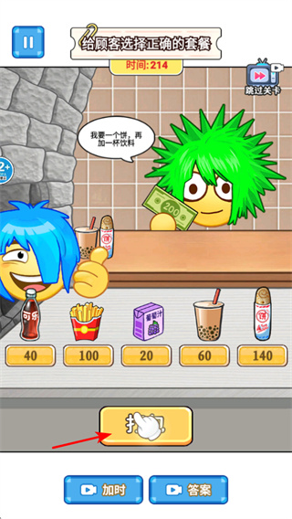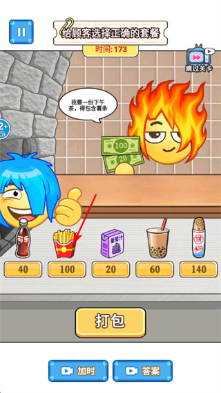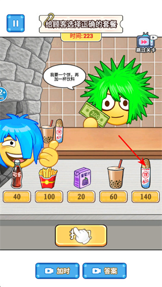 顧客會提出套餐組合需求,食物售價與鈔票數(shù)額,從可樂、薯條、奶茶等多種品類中挑選正確組合,考驗搭配計算能力。