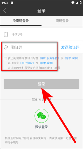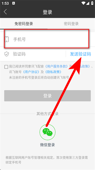 3、在登錄頁面,輸入手機號,點擊發(fā)送驗證碼。