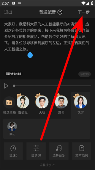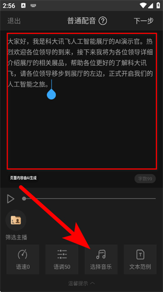 3、在普通配音頁(yè)面,可編輯文本,還能調(diào)整語(yǔ)速、語(yǔ)調(diào)、選擇音樂(lè)等。