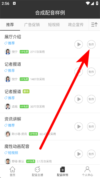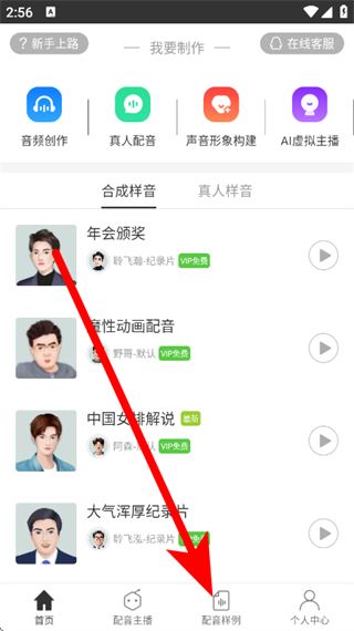 1、打開(kāi)訊飛配音,點(diǎn)擊底部配音樣例,進(jìn)入合成配音樣例頁(yè)面。