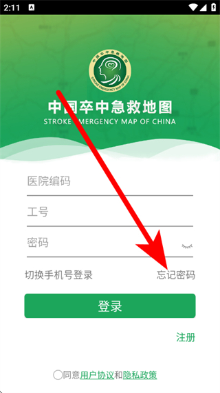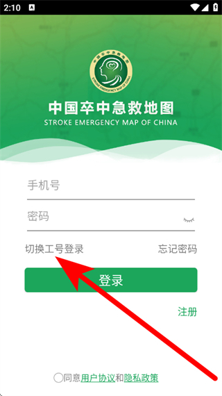 1、打開(kāi)卒中急救地圖,在登錄頁(yè)面,點(diǎn)擊切換工號(hào)登錄。