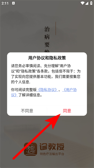 1、打開診教授,在彈窗中,點(diǎn)擊同意,進(jìn)入登錄頁面。