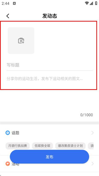2、在發(fā)動態(tài)頁面添加圖片,填寫標題和分享內(nèi)容。