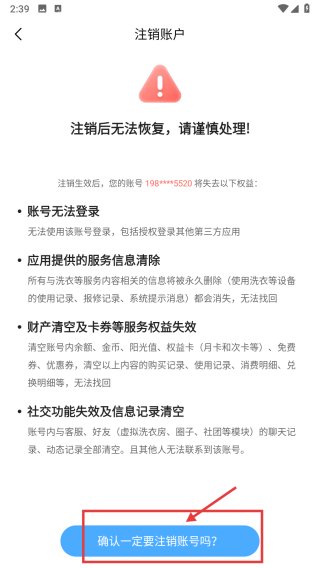 4、在注銷(xiāo)賬戶(hù)確認(rèn)頁(yè)面,點(diǎn)擊確認(rèn)一定要注銷(xiāo)賬號(hào)嗎按鈕,完成賬戶(hù)注銷(xiāo)操作。