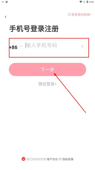 3、在手機(jī)號登錄注冊頁面,輸入手機(jī)號碼,點(diǎn)擊下一步。