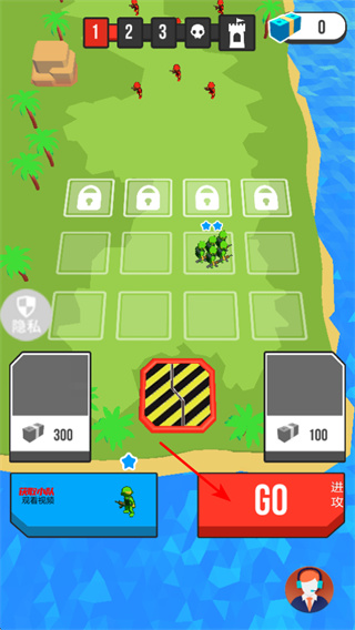 2、點(diǎn)擊GO按鈕,可發(fā)動(dòng)士兵進(jìn)攻,這是推進(jìn)戰(zhàn)斗的核心的操作,點(diǎn)擊后士兵將向目標(biāo)的區(qū)域發(fā)起了攻擊。
