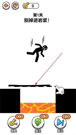 1、打開游戲點(diǎn)擊開始游戲按鈕直接進(jìn)入游戲,通過在屏幕畫出線條保護(hù)火柴人不受到傷害。