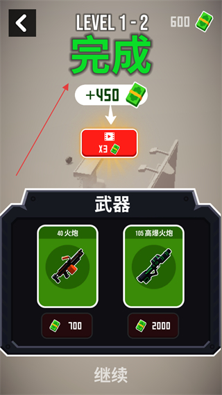 4、成功消滅所有敵方單位后,完成關卡,領取金幣獎勵,可選擇解鎖新武器,繼續(xù)挑戰(zhàn)下一關。