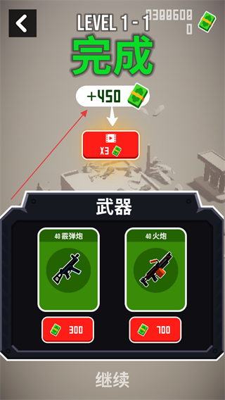 4、成功消滅所有敵人后,完成LEVEL1-1關(guān)卡,領(lǐng)取450金幣獎(jiǎng)勵(lì),可選擇解鎖新武器,點(diǎn)擊繼續(xù)進(jìn)入下一關(guān)。