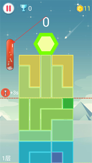 4、在關(guān)卡內(nèi)注意左側(cè)的倒計時,下落到一定高度可以增加倒計時時間。
