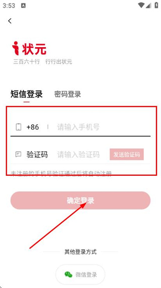 3、在短信登錄頁(yè)面輸入手機(jī)號(hào)和驗(yàn)證碼,點(diǎn)擊確定登錄,完成登錄操作。