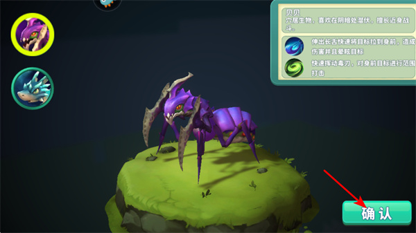 1、游戲中點擊確認按鈕,可選擇并確定使用的生物如紫色螞蟻貝貝,開啟生物養(yǎng)成與戰(zhàn)斗的關(guān)鍵操作,點擊后將進入生物組裝環(huán)節(jié)。