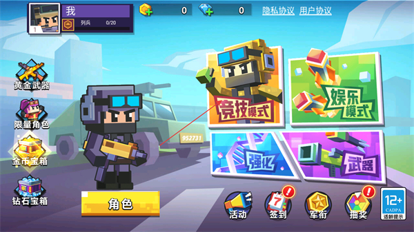 1、打開槍戰(zhàn)行動重生游戲,在主頁面選擇競技模式,進入游戲?qū)?zhàn)頁面。