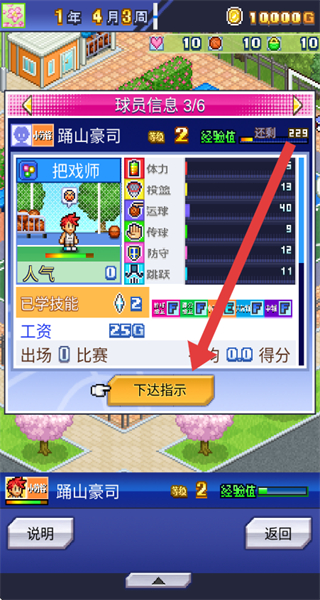 2、在球員信息界面,點(diǎn)擊下達(dá)指示按鈕,彈出操作菜單。
