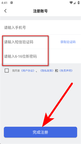 4、輸入短信驗證碼、設(shè)置6-16位新密碼,勾選后,點擊完成注冊,完成賬號注冊。