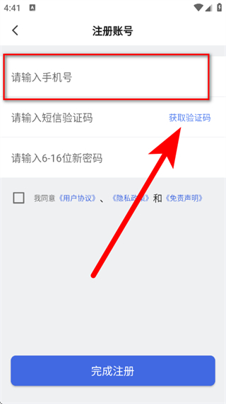 3、在注冊賬號頁面,輸入手機號,點擊獲取驗證碼。