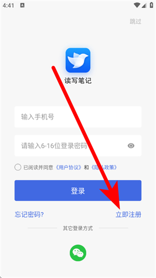 2、在讀寫筆記登錄頁面,點擊立即注冊,進入注冊流程。