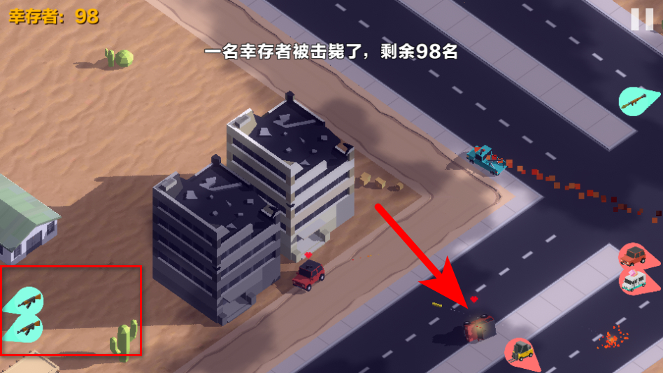 3、拾取場景中的武器道具,增強(qiáng)汽車的攻擊能力,更高效地淘汰其他幸存者。