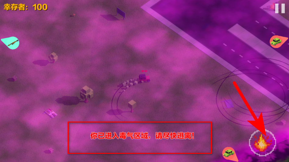 4、注意避開毒氣區(qū)域,若進(jìn)入需盡快逃離,同時利用攻擊手段淘汰對手,爭取成為最后的幸存者。