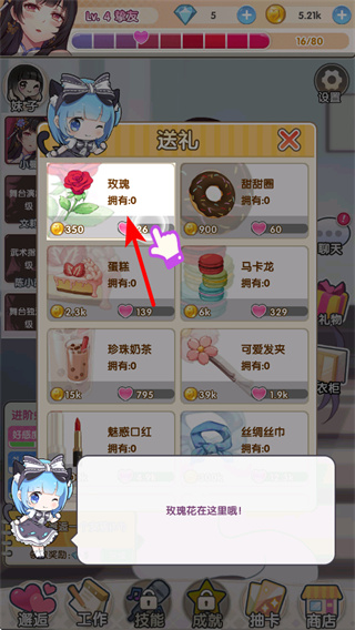2、點(diǎn)擊送禮界面的禮物如玫瑰,可贈(zèng)送禮物提升與角色的好感度,是角色羈絆核心操作,贈(zèng)送需根據(jù)角色喜好選擇禮物。