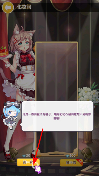 3、點(diǎn)擊抽一次按鈕,可在化妝間抽取裝扮道具,這是獲取稀有服裝的關(guān)鍵步驟,抽取時(shí)需關(guān)注鉆石消耗和道具的稀有度。