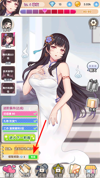 4、完成任務(wù)如送禮任務(wù)后點(diǎn)擊完成按鈕,可領(lǐng)取任務(wù)獎(jiǎng)勵(lì),這是積累資源的關(guān)鍵策略,領(lǐng)取時(shí)需確保任務(wù)條件已達(dá)成。