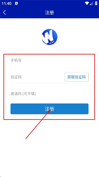 4、輸入手機號獲取驗證碼,點擊注冊,完成賬號注冊操作。