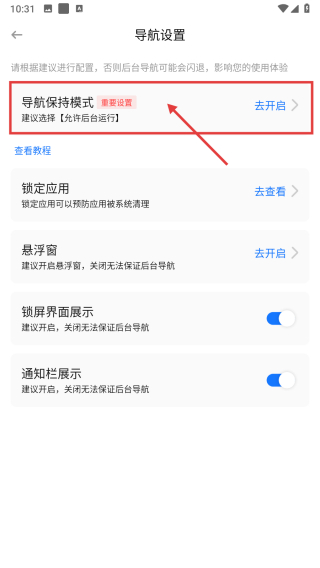 4、在導(dǎo)航設(shè)置頁面,點(diǎn)擊導(dǎo)航保持模式選項(xiàng),進(jìn)入模式設(shè)置頁面,開啟導(dǎo)航保持模式。