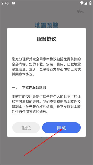 1、在地震預(yù)警服務(wù)協(xié)議彈窗中,點(diǎn)擊同意,進(jìn)入APP主界面。