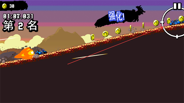 2、觸發(fā)強(qiáng)化效果,提升賽車性能,收集更多金幣,保持領(lǐng)先優(yōu)勢。