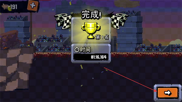 4、率先到達(dá)終點(diǎn),獲得第1名,領(lǐng)取金幣獎(jiǎng)勵(lì),點(diǎn)擊箭頭按鈕繼續(xù)挑戰(zhàn)。