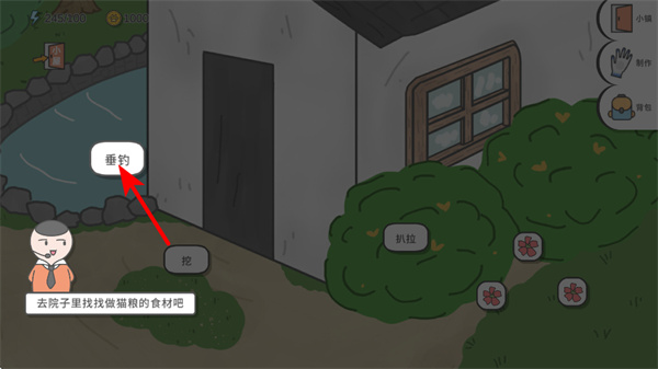 2、點擊垂釣按鈕,可在院子的池塘釣魚獲取食材,這是豐富貓糧食材的核心操作,垂釣時需耐心等待魚上鉤。