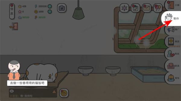 3、點制作按鈕,可進入制作臺制作貓飯,這是喂養(yǎng)貓咪的關鍵步驟,制作時需選擇合適的貓飯類型如普通貓飯。