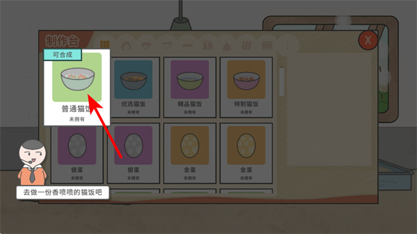 4、在制作臺選擇并合成貓飯,可提升貓咪的狀態(tài),這是保障貓咪健康的關鍵策略,合成時需確保食材充足。