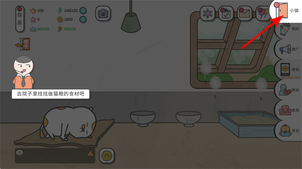 1、游戲中點擊小鎮(zhèn)按鈕,可前往院子尋找做貓糧的食材,獲取貓糧原料的關鍵操作,需關注院子里的資源分布。