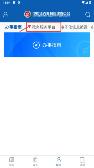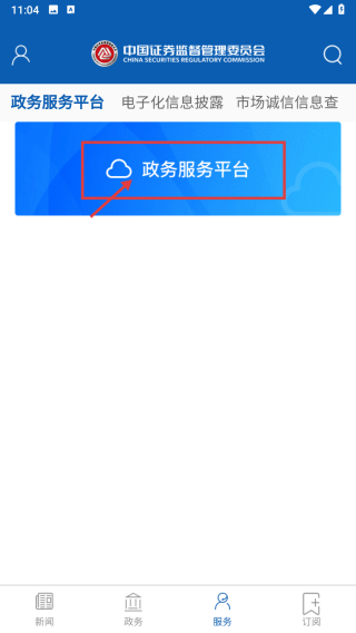 1、打開證監(jiān)會(huì)APP,點(diǎn)擊底部服務(wù)選項(xiàng),進(jìn)入服務(wù)頁面。