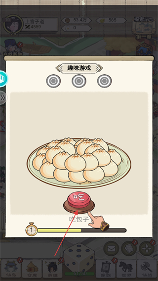 3、趣味游戲隨機出現(xiàn),如吃包子游戲通過點擊下方紅色按鈕在倒計時結(jié)束前吃完所有包子。