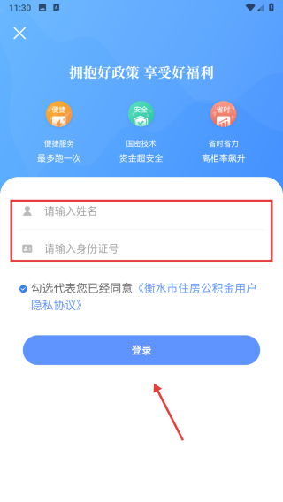 3、在登錄頁面,輸入姓名和身份證號(hào),勾選同意隱私協(xié)議后,點(diǎn)擊登錄按鈕,完成賬號(hào)登錄操作。