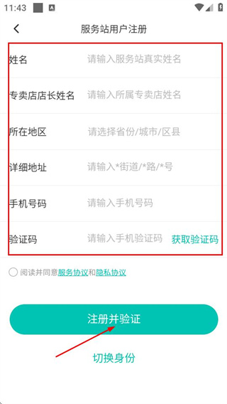 3、填寫表單中的姓名、專賣店店長姓名等信息,勾選協(xié)議后點(diǎn)擊注冊并驗(yàn)證,完成服務(wù)站用戶注冊操作。