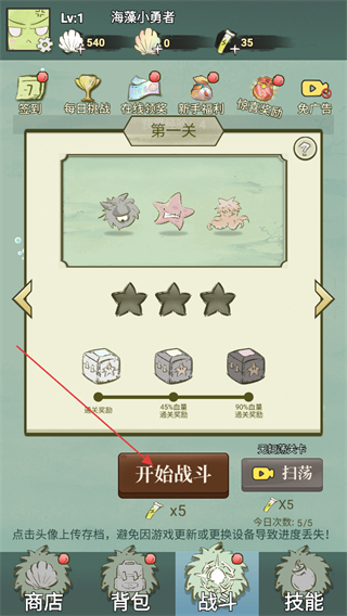 1、打開游戲進(jìn)入菜單界面,查看關(guān)卡通關(guān)條件點(diǎn)擊開始戰(zhàn)斗進(jìn)入關(guān)卡。