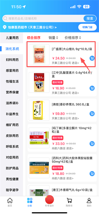2、在分類頁面,點擊消化系統(tǒng)選項,進入消化系統(tǒng)藥品列表頁。